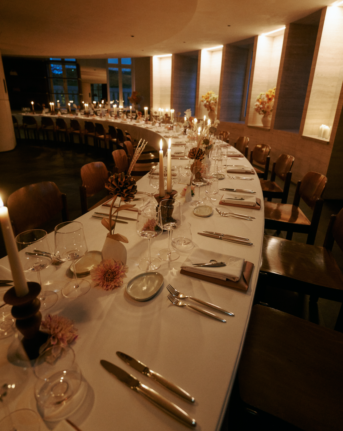 The concept transforms the boutique into a living workshop—an “atelier of curiosities” where craftsmanship takes center stage. Guests were invited to wander through an artistic journey, discovering every stage of how Polène’s sculptural bags and fine jewelry are brought to life. The space blends light, sound, and scent, with a central luminous installation that rhythmically illuminates each artisanal process: leather selection, hand-sewing, finishing touches, and the patacabra’s signature polish.